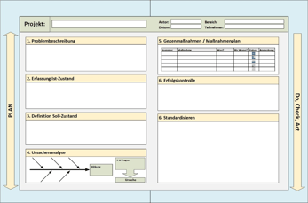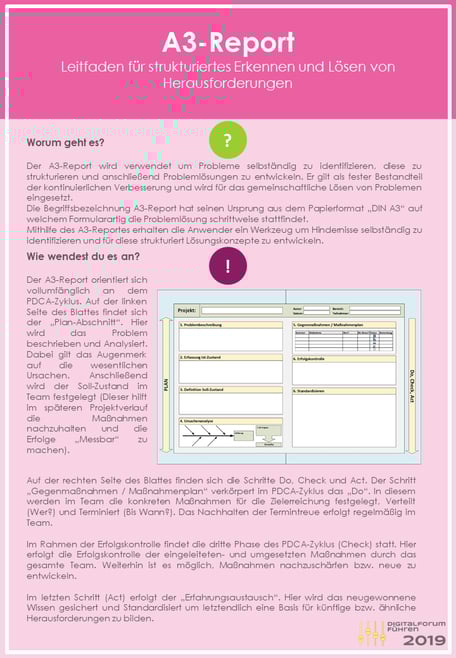 Und wenn ihr den PDCA-Zyklus (Plan-Do-Check-Act) kennt: der A3-Report hilft euch, genau diesen Arbeitsprozess zu visualisieren und nimmt euch Schritt für Schritt an die Hand, diesen zu verfolgen.