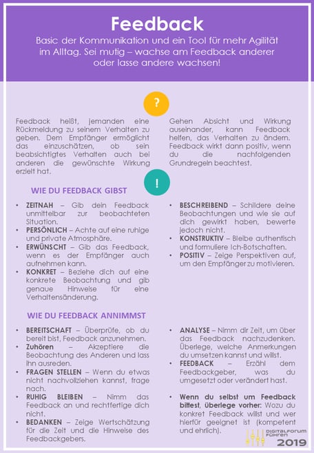 Feedback kannst du jederzeit und ohne großen Aufwand erfragen bzw. geben. Wichtig ist, dass du ein paar Regeln beachtest – sowohl beim Geben als auch beim Annehmen von Feedback. Diese haben wir für dich als Karte kompakt zusammengefasst. Zur konkreten Anwendung im Alltag bieten wir dir verschiedene Varianten an, suche dir die Passende aus oder noch besser – teste sie alle!